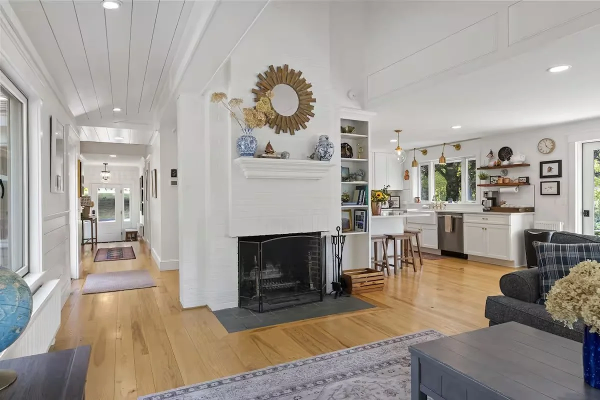 The home’s layout is ideal for entertaining large gatherings with a centrally located, fully equipped kitchen leading to a dining area with seating for up to 10. A beautiful light-filled family room offers panoramic views of the surrounding lawns, towering trees and beautiful Damariscotta lake. The expansive wraparound deck is furnished with comfortable seating, a coffee table with fire feature and a large alfresco dining table with Weber grill.